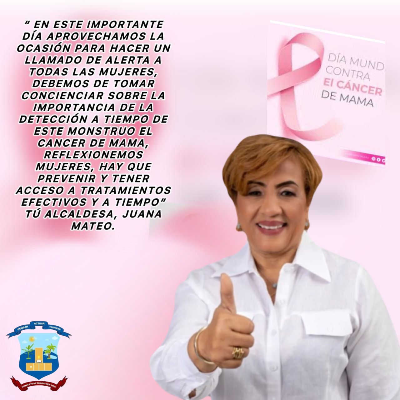 “ En este importante día aprovechamos la ocasión para hacer un llamado de alerta a todas las mujeres, debemos de tomar concienciar sobre la importancia de la detección a tiempo de este monstruo EL CANCER DE MAMA, reflexionemos mujeres, hay que prevenir y tener acceso a tratamientos efectivos y a tiempo”